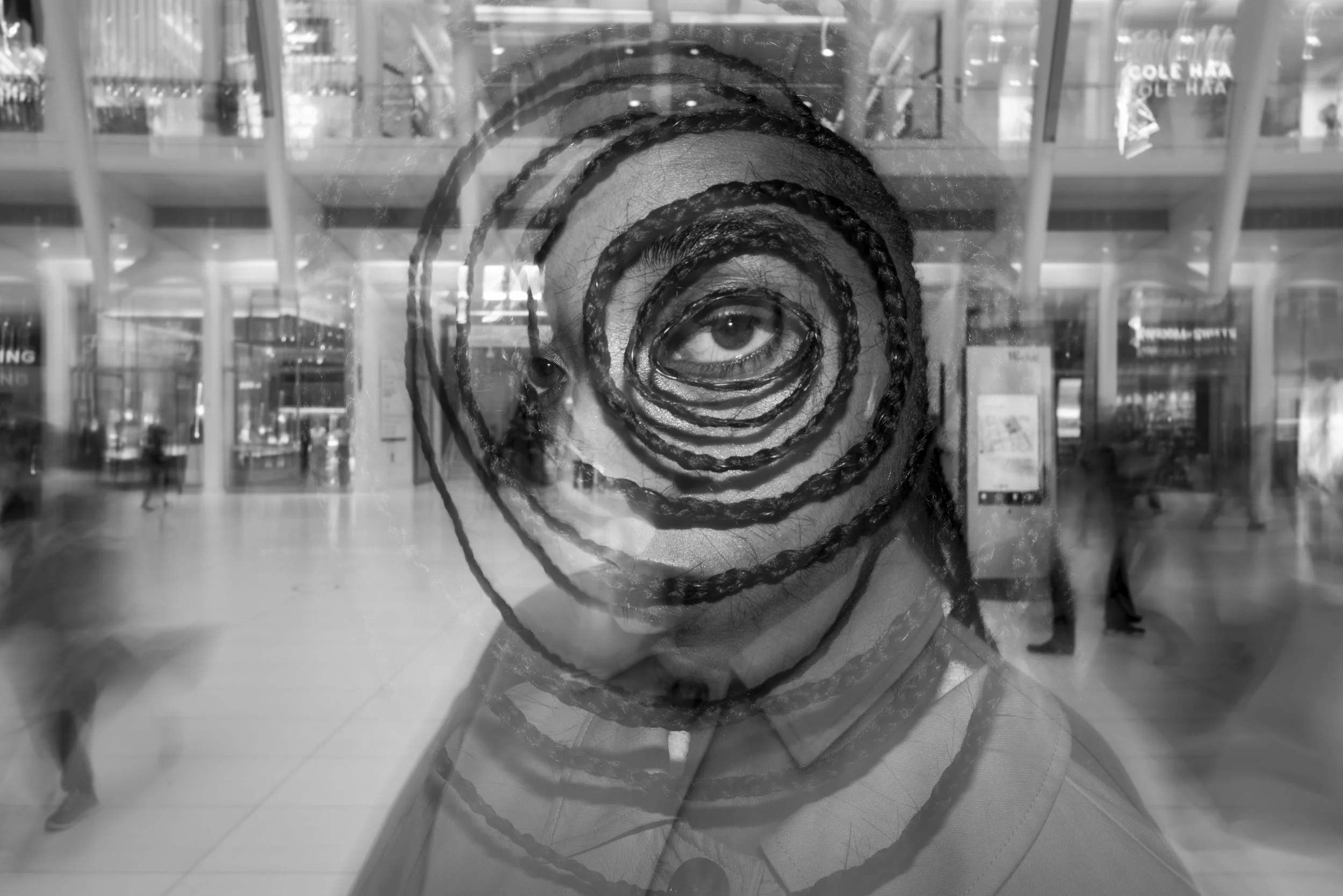 This image captures a surreal expression of inner turbulence through a striking fusion of anime influence and avant-garde hairstyling. Inspired by Naruto and the spiraling symbolism of Uzumaki, the coiled braids orbit the subject’s face like a vortex—an external manifestation of internal anxiety. The hypnotic spiral draws the viewer into a psychological storm, where control and chaos blur. Set against the sharp geometry of the city, the image becomes a visual metaphor for being consumed by one’s own thoughts while trying to hold form within a world that never stops moving.